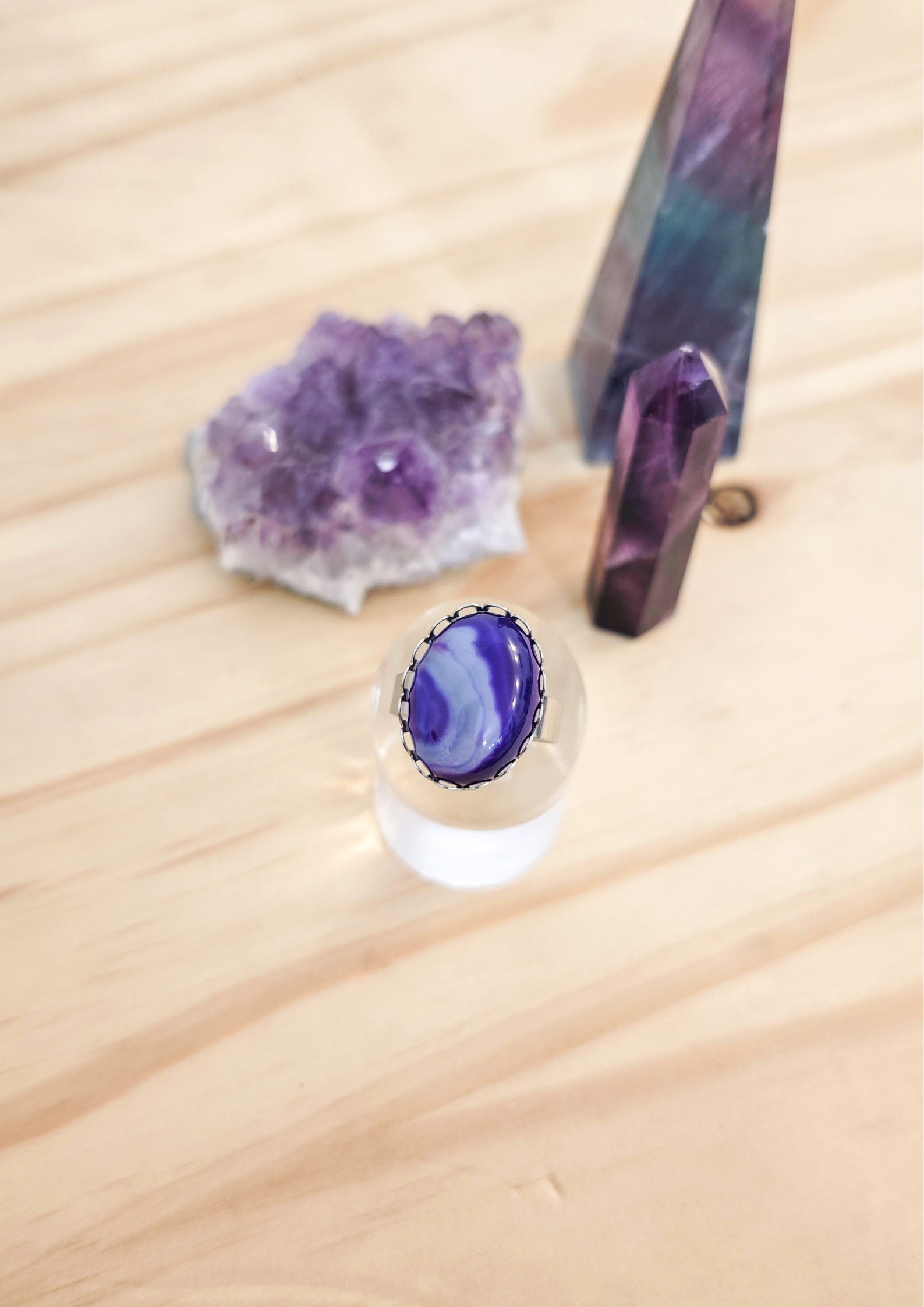 Une bague artisanale au violet profond, sublimée par les variations naturelles de l’agate teintée.
