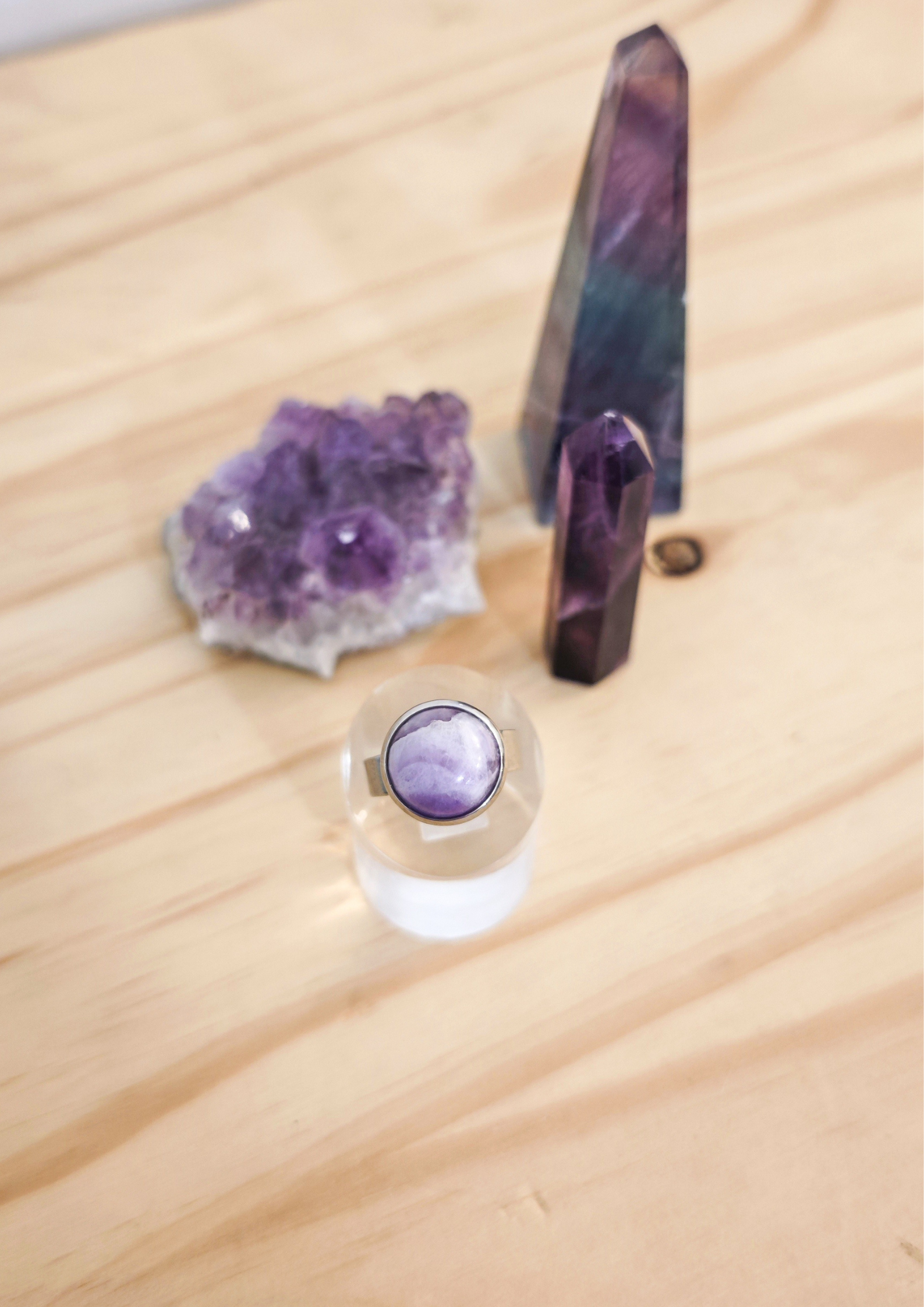 Bague artisanale ornée d’une pierre naturelle d'améthyste, chaque pièce présentant des nuances uniques.
