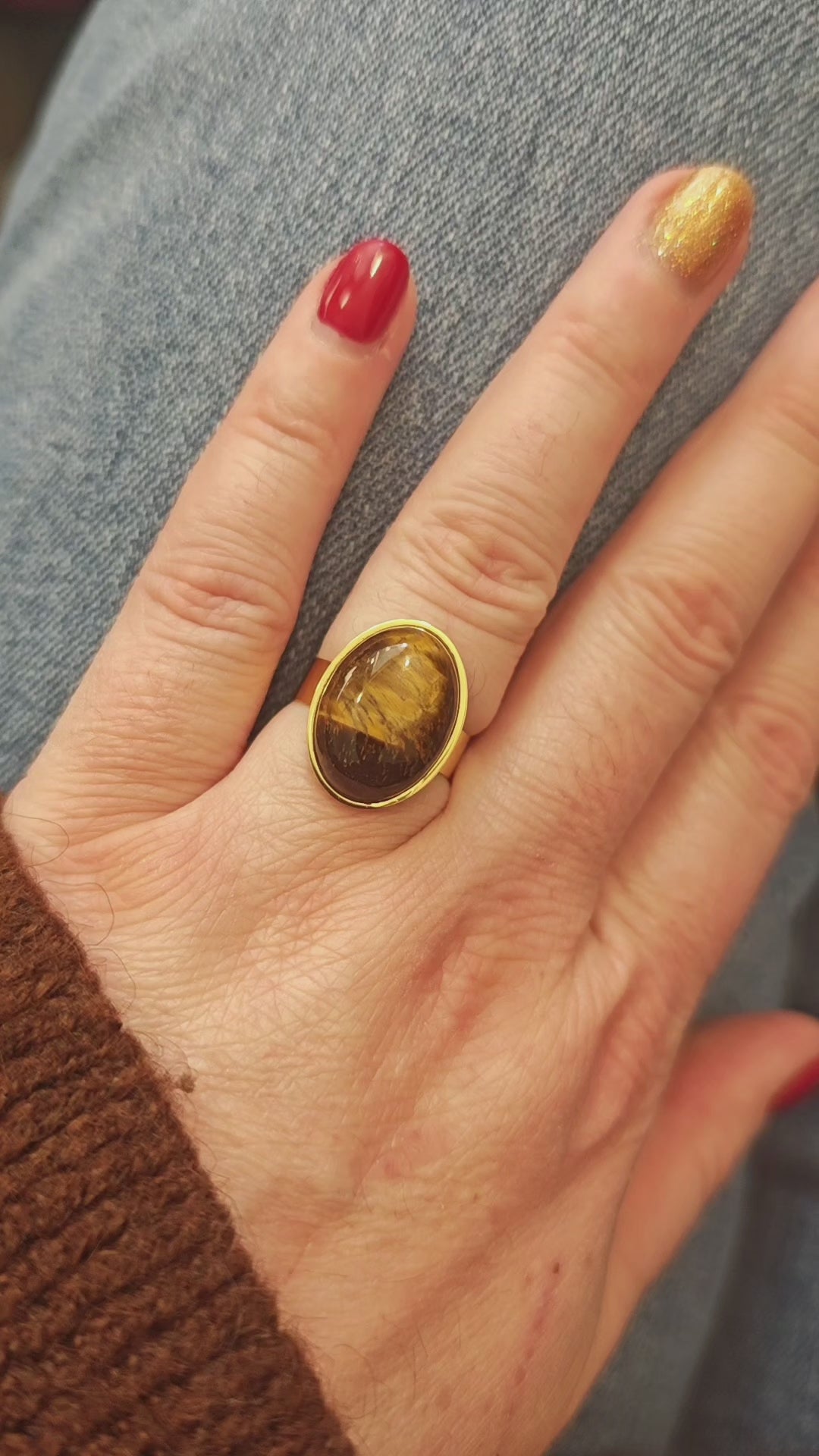 Bague en acier inoxydable doré ornée d’une pierre naturelle œil de tigre. Ses reflets bruns et dorés apportent chaleur et caractère à votre main.
