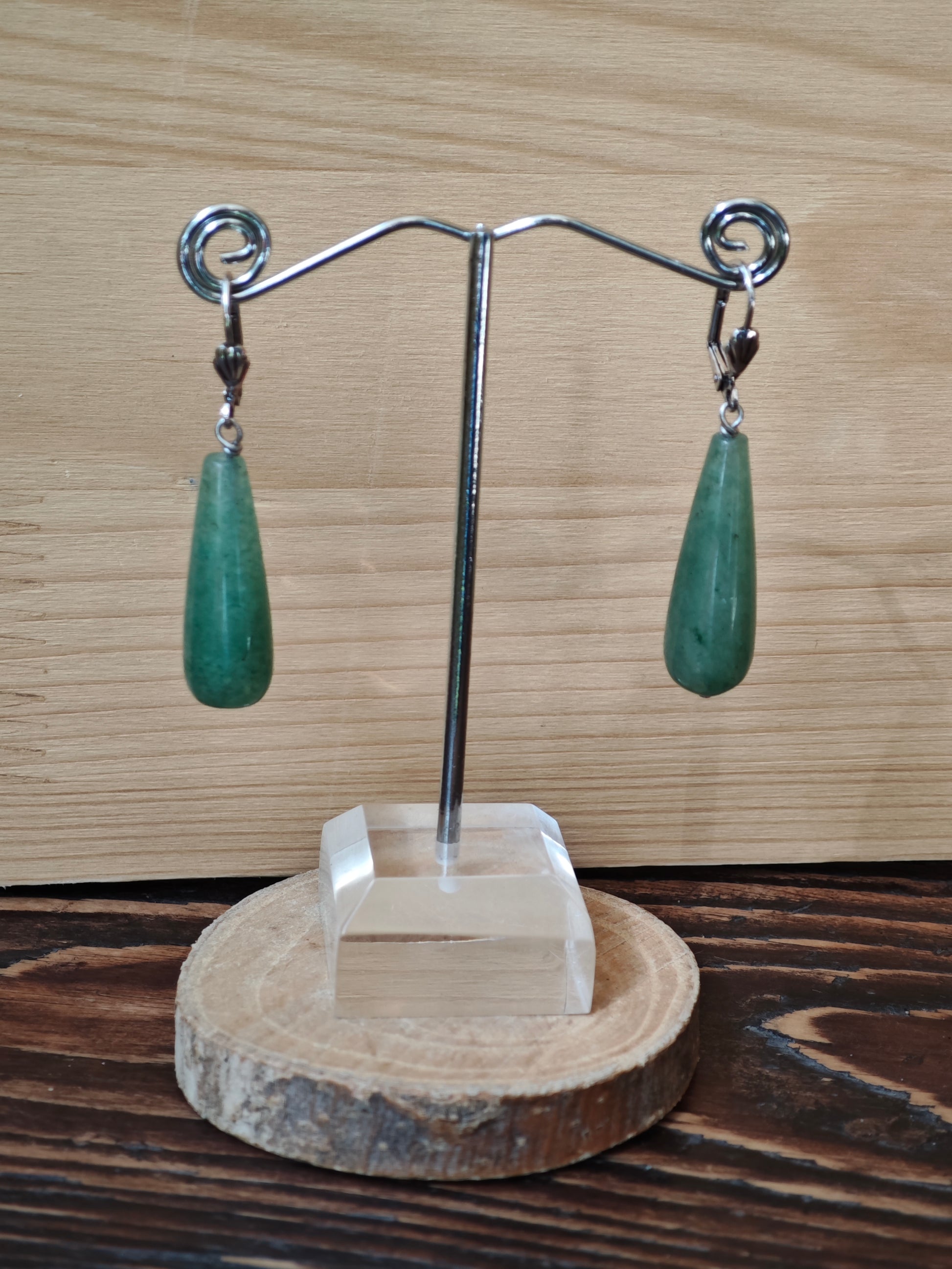 Ces boucles mettent en valeur deux gouttes d'aventurine. Leur forme allongée apporte une belle élégance, tout en restant légères et faciles à porter.