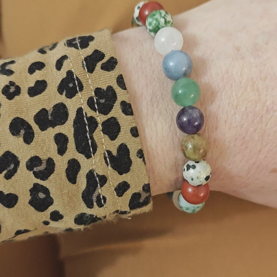 Pierre : Jaspe rouge et dalmatien, Aventurine, Sodalite, Améthyste, Jade blanc, Agate mousse et Unakite.