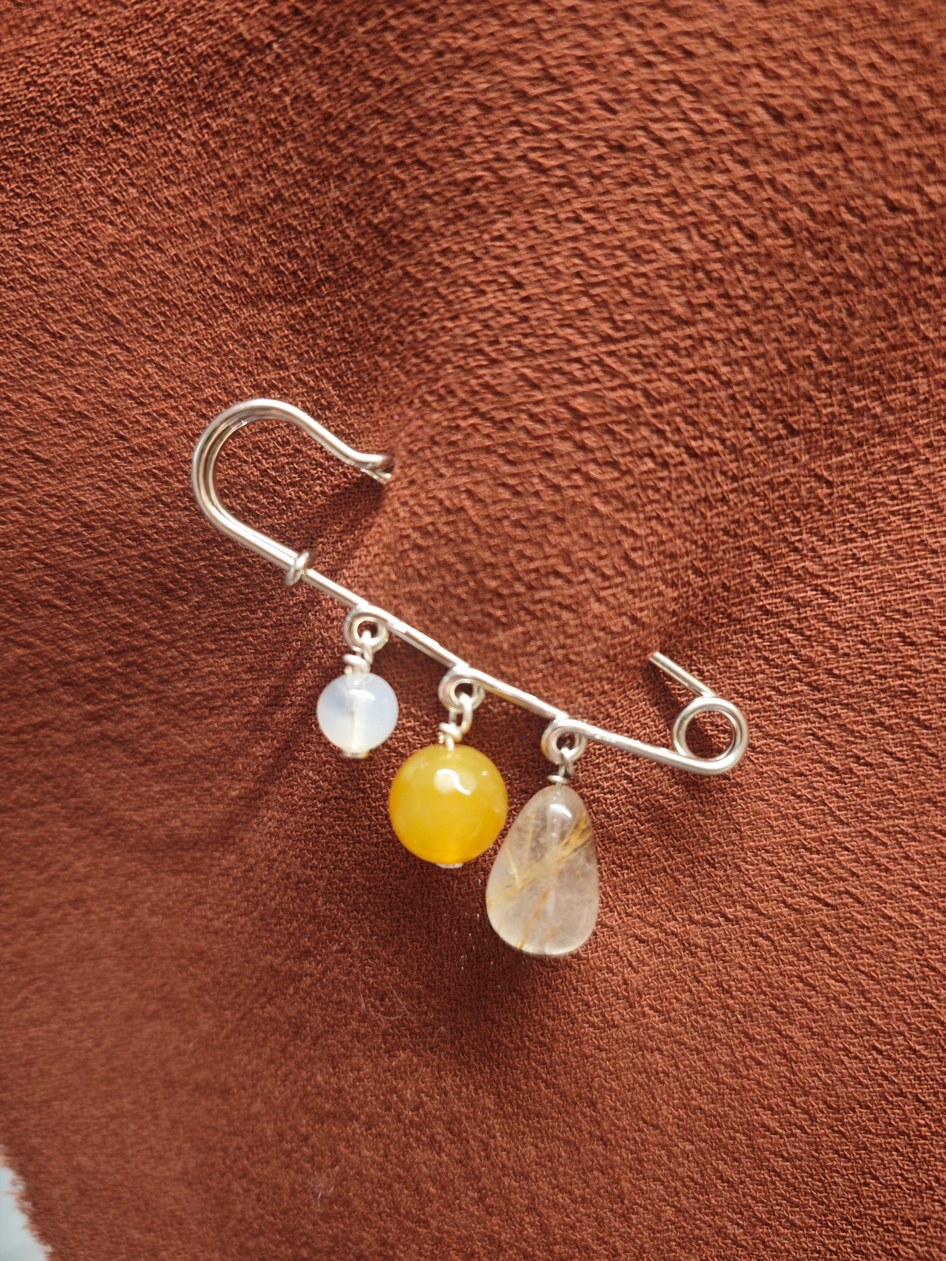 Cette broche artisanale met à l’honneur l’agate et le quartz rutile, choisis pour leurs teintes douces et leurs jeux de transparence.