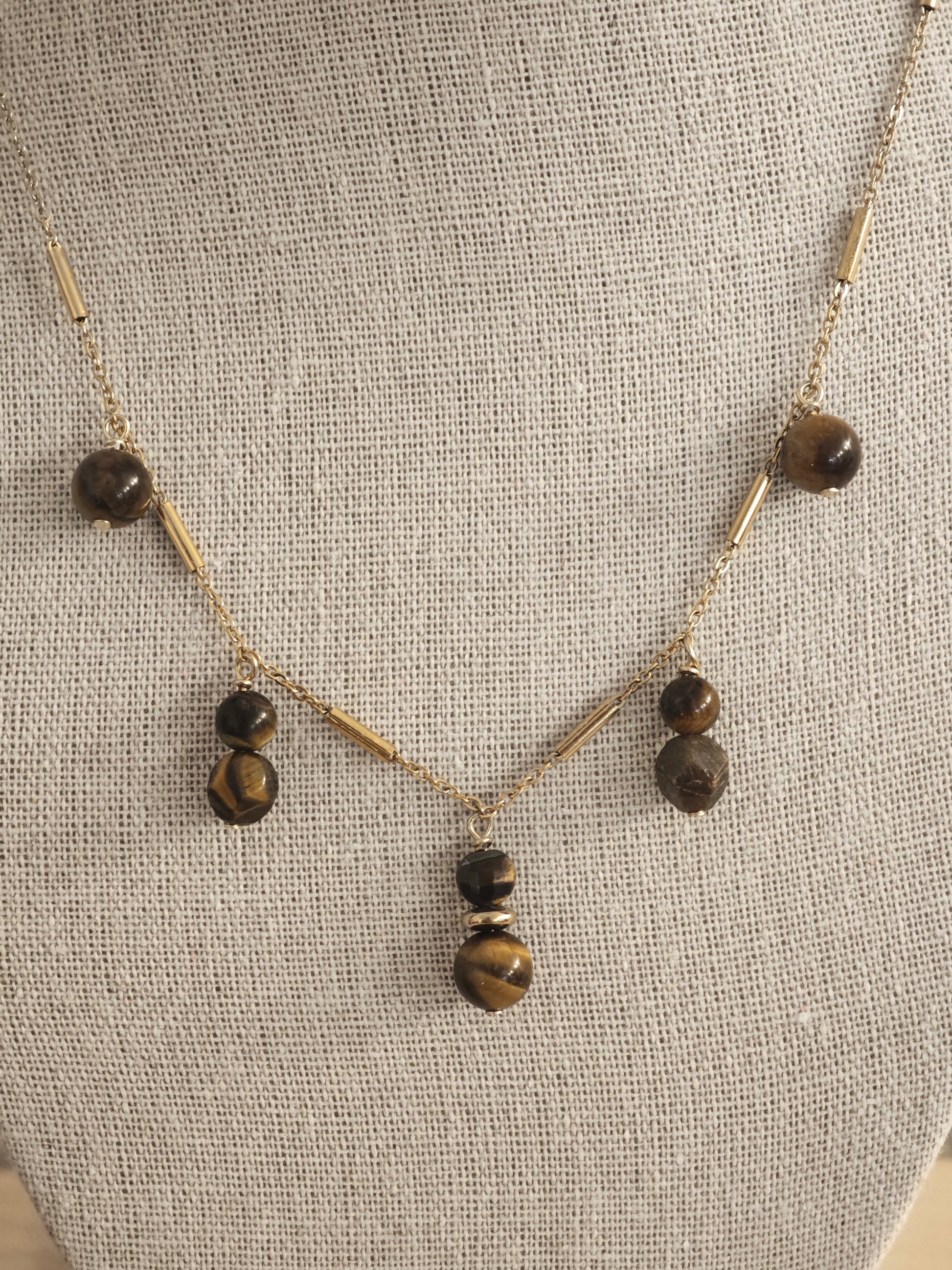 Ce collier en œil de tigre, monté sur une chaîne en acier inoxydable doré, joue avec la lumière et les mouvements. Chaque pierre semble raconter un instant, comme un bijou que l’on choisit sans réfléchir et que l’on ne quitte plus.